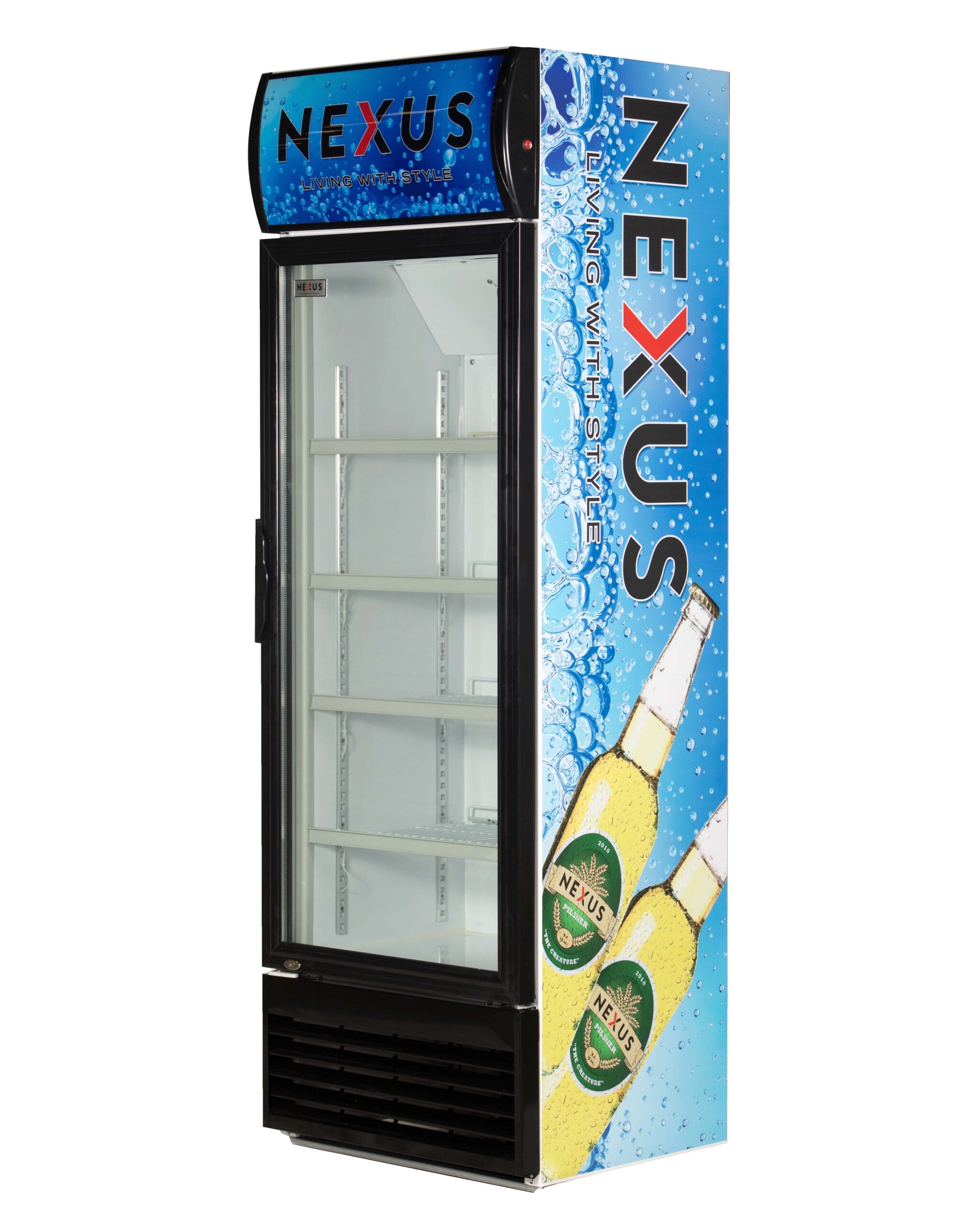 Transparent glass door Fast cooling function Display light 3 carrier shelves Colour – Blue